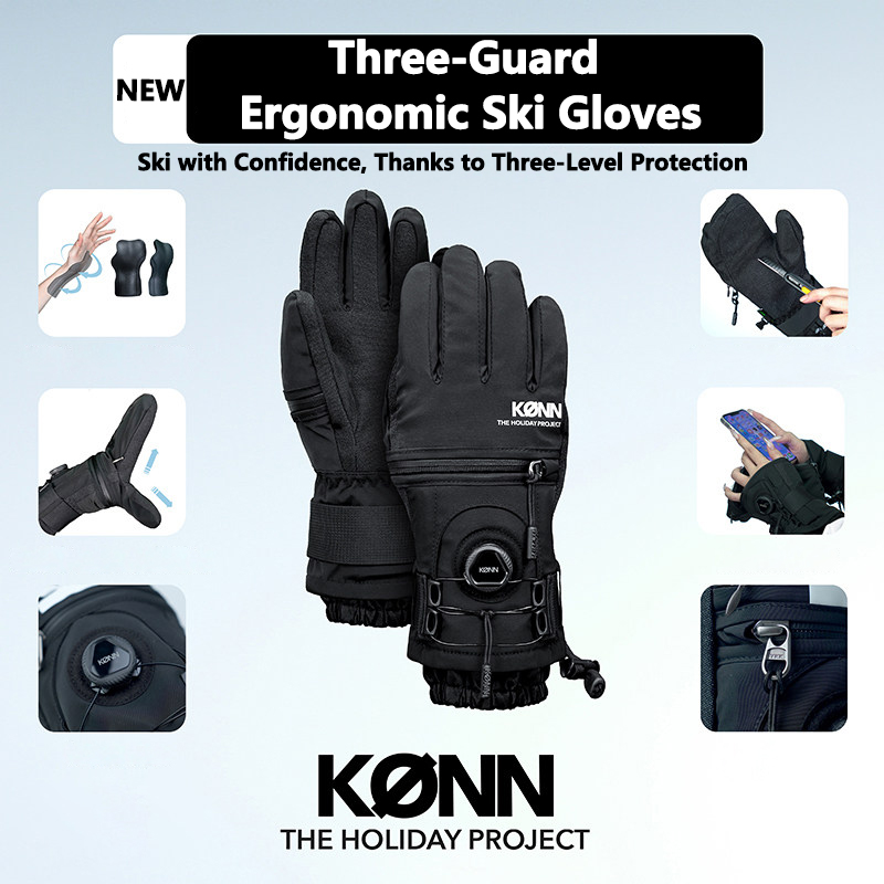 KONN 2026 Ski Gloves Ergonomic Design with Triple Protective Plates External Five-Finger Wire Buckles Kevlar-Reinforced Wear-Resistant Back Fully Openable