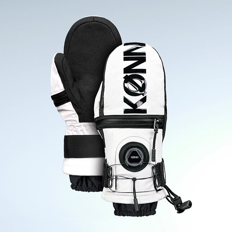 KONN White Ski Gloves with Black Logo Ergonomic Design with Triple Protective Pads Steel Wire Buckle Kevlar-Reinforced Wear-Resistant Back Adjustable Opening